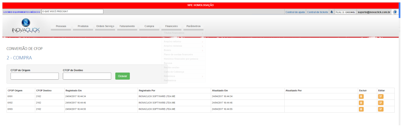 Foi desenvolvido um relatório personalizado, o qual converte os códigos CFOP de Origem para o CFOP de Destino nos tipo de operação Compra para Revenda e Compra para Uso e Consumo. Logo, necessário informar esta conversão de COFOP no DANT ERP em Parâmetros > Tipo de Operação.