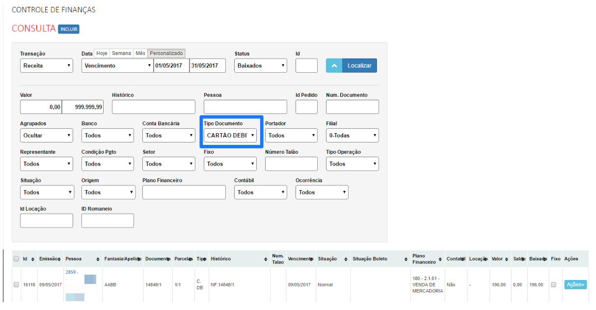 Portanto, foi realiza correção no relatório de consulta de títulos financeiros, a busca é concluída com todos tipos de documentos, inclusive com cartão de débito e cartão de crédito.