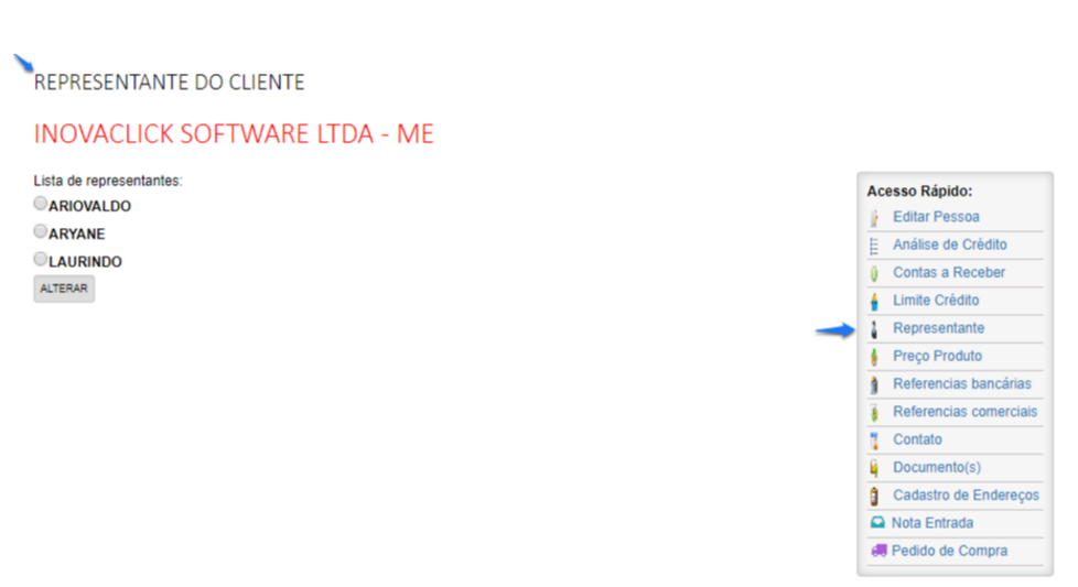 No cadastro de pessoas, ao incluir o representante, no acesso rápido, somente informa os representantes ativos.
