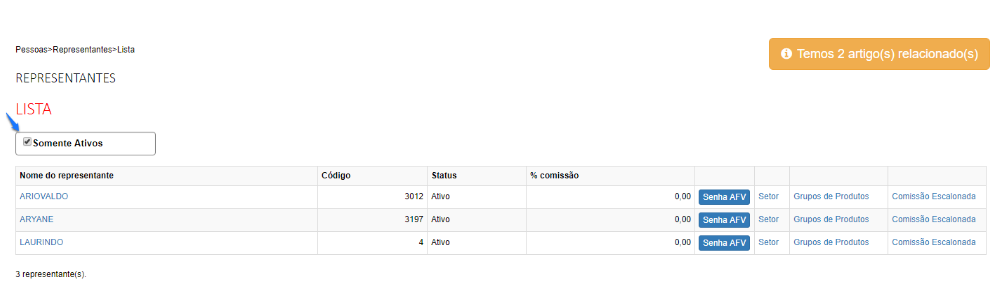 Portanto, no cadastro de pessoas, em acesso rápido representantes, somente apresente os representantes ativos.