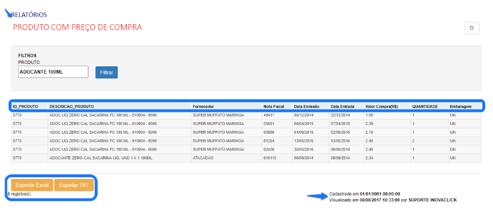 Este relatório poderá ser exportado ao excel e, também em formato txt, além do histórico de log da última visualização, conforme informações no rodapé.