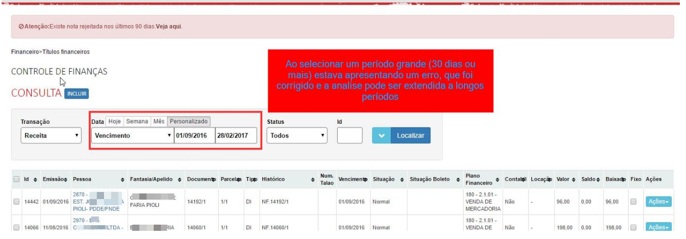Em títulos financeiros > Lista, ao selecionar períodos maiores que 30 dias, retornava um erro de período excedido. Correção para aceitar longos períodos.