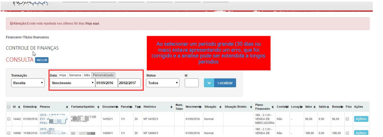 Melhoria na consulta de títulos financeiros, aumentando assim a velocidade na consulta. Em títulos financeiros > Lista, ao selecionar períodos maiores que 30 dias, retornava um erro de período excedido. Correção para aceitar longos períodos. Referente a OS 19900.