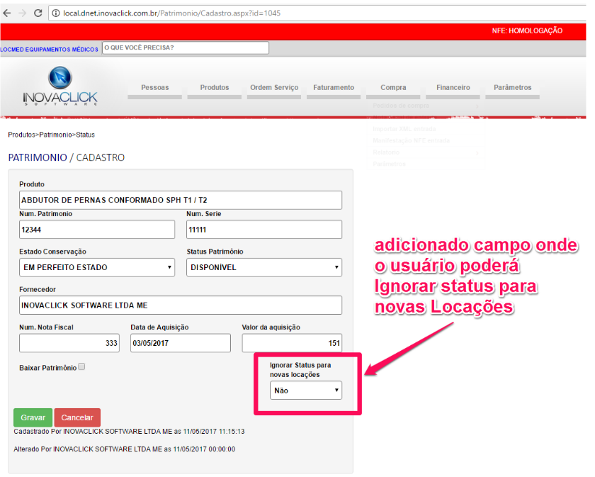 Melhoria na tela de cadastro do patrimônio. Realizado implementação para a tela de patrimônio, onde foi adicionado campo "Ignorar Status da Locação". Referente a OS 18362.