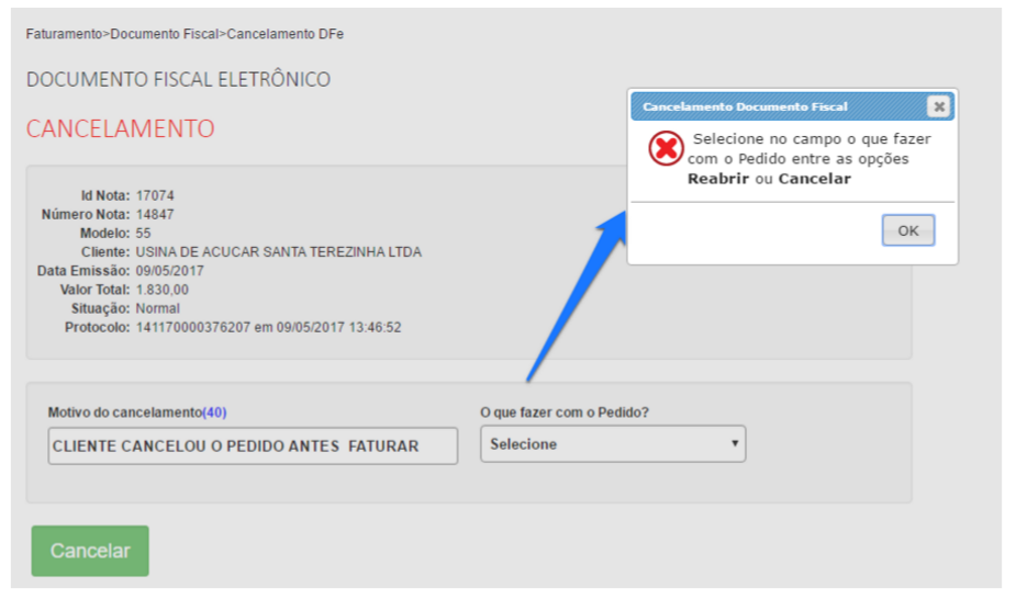 Caso, não selecionar nenhuma opção e, prosseguir somente com recurso cancelar, apresenta uma notificação ao usuário, sendo necessário: “Selecione no campo o que fazer com o Pedido entre as opções Reabrir ou Cancelar.”