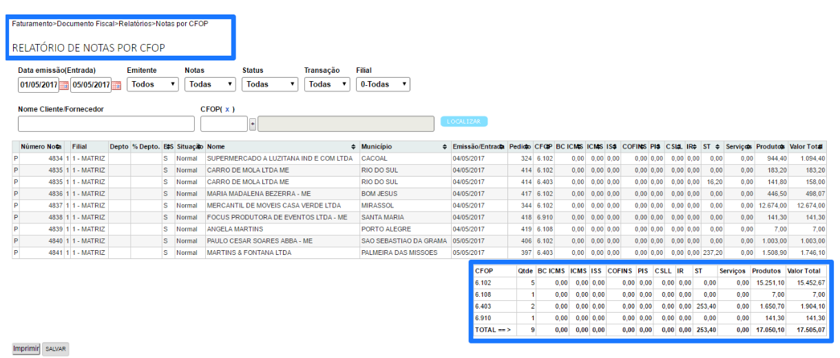 Em faturamento > Documento Fiscal > Relatórios > Notas por CFOP