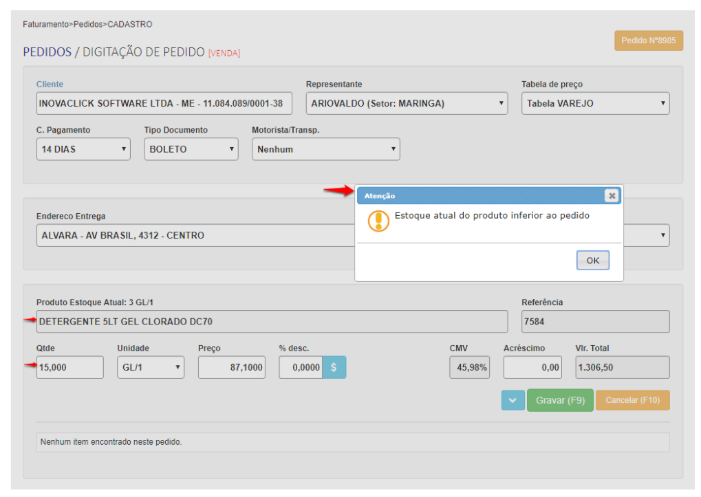 Ao inserir um produto no pedido que não tem em estoque, apresenta uma mensagem de atenção ao usuário “Estoque atual do produto inferior ao pedido”