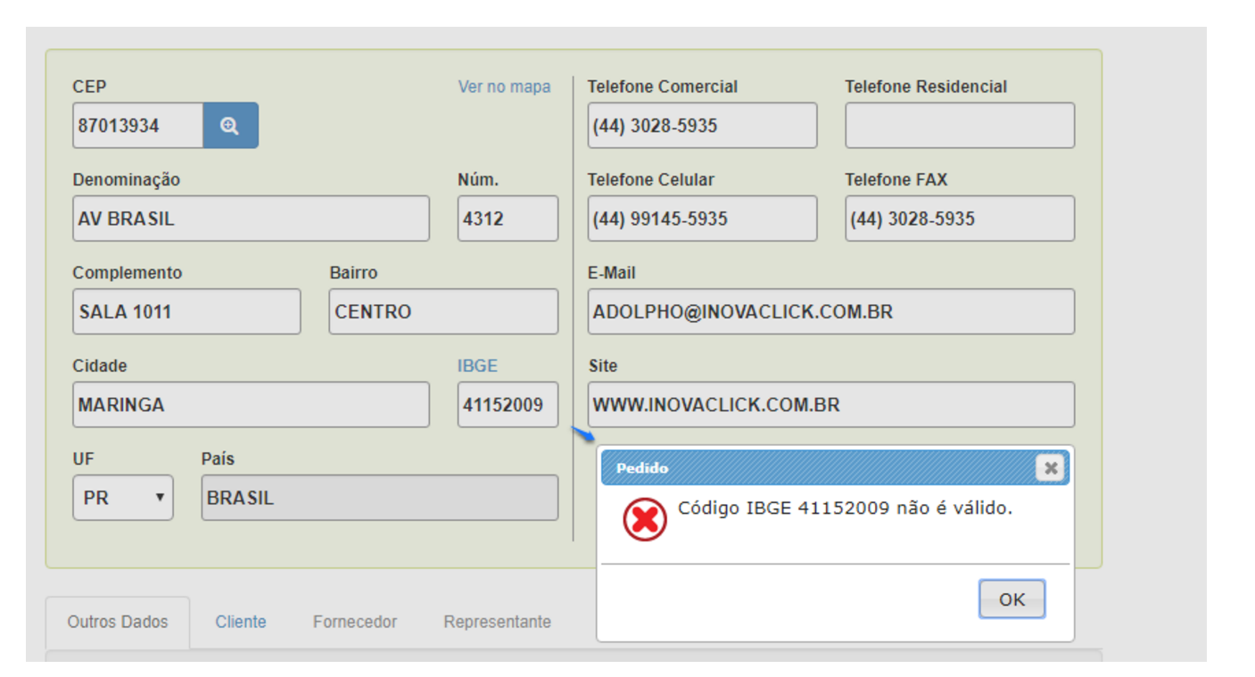 Ao incluir de forma manual um código do IBGE que não é válido, automaticamente informa ao usuário que “Código IBGE número não é válido.”