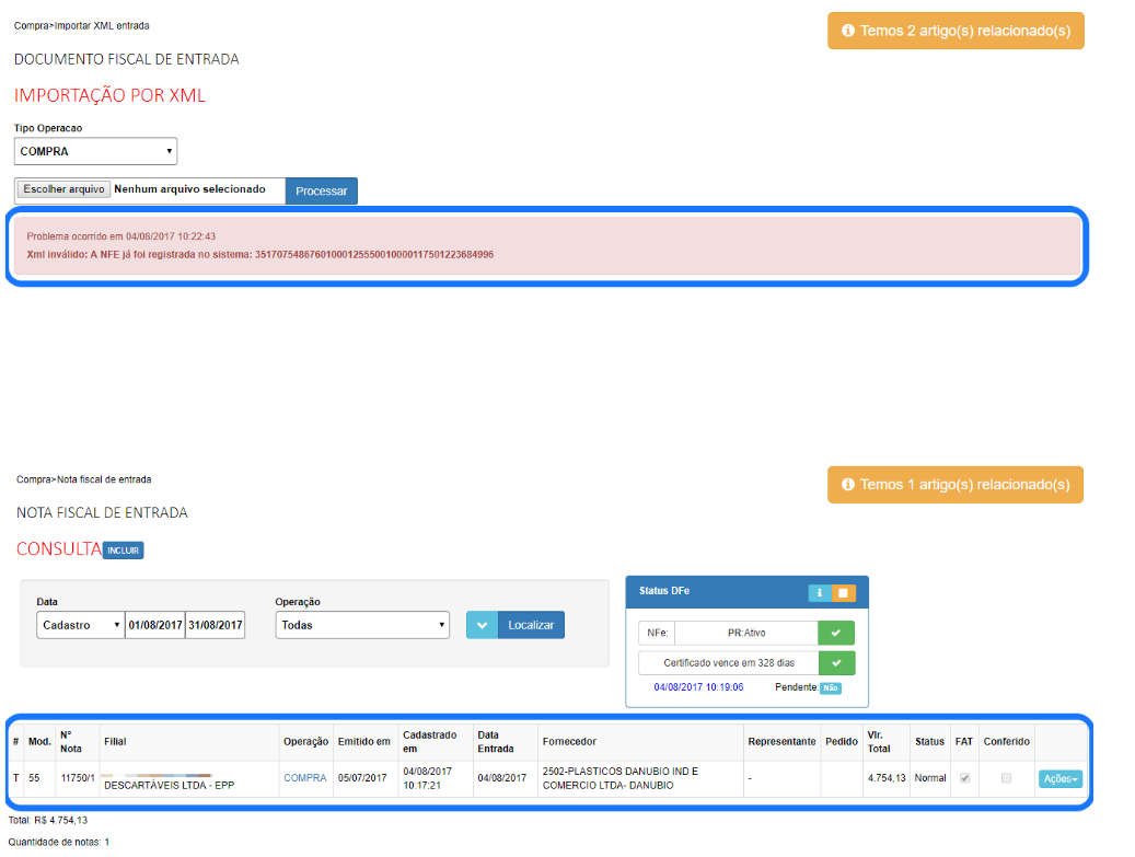 Não é possível importar nf-e de entrada mais de uma vez. Automaticamente o aplicativo informa ao usuário que “A NFE já foi importada no sistema: número da chave ...”