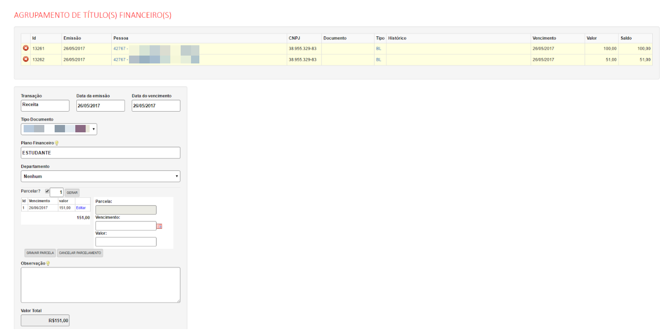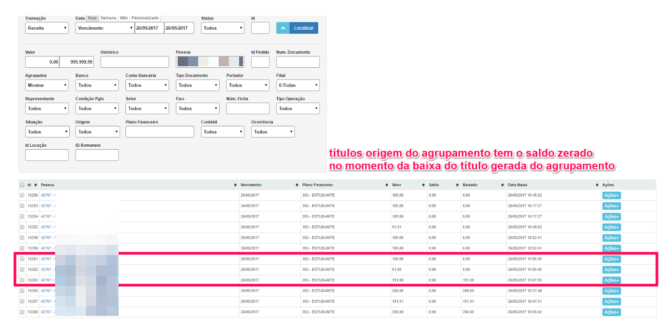 Anteriormente os títulos que tinha origem de agrupamentos ao ser baixados o título originado era baixado corretamente, no entanto os títulos que deram origem ao agrupamento continuavam pendente e na lista de contas a receber, com esta correção ao criar um agrupamento, os títulos que deram origem a este agrupamento tem seu status mudado e não entra mais na lista de títulos financeiros.