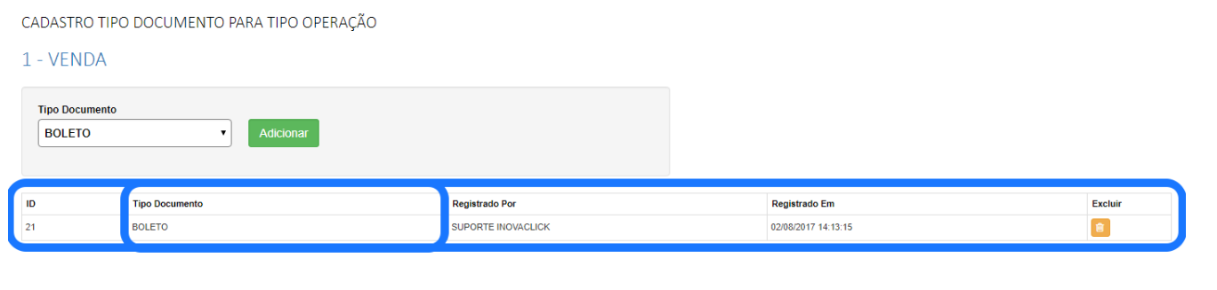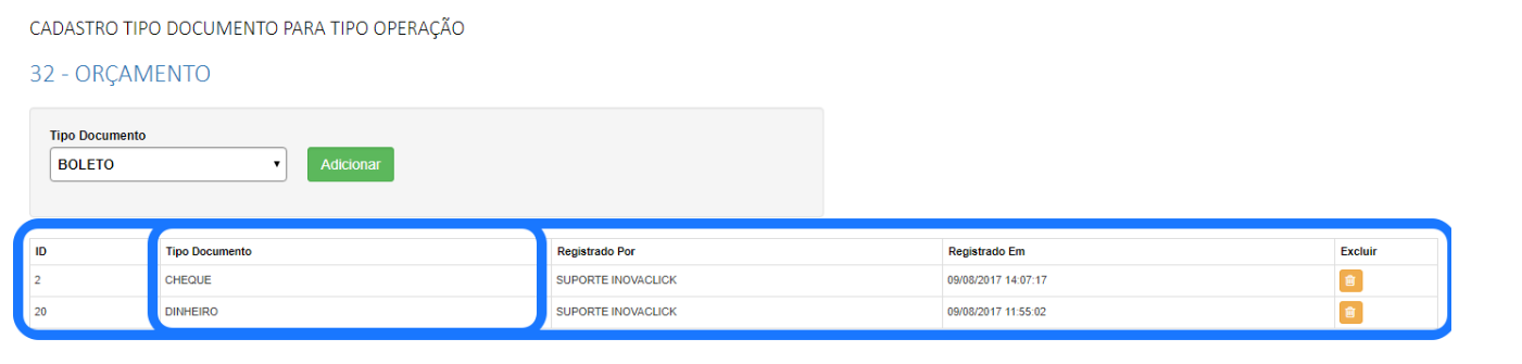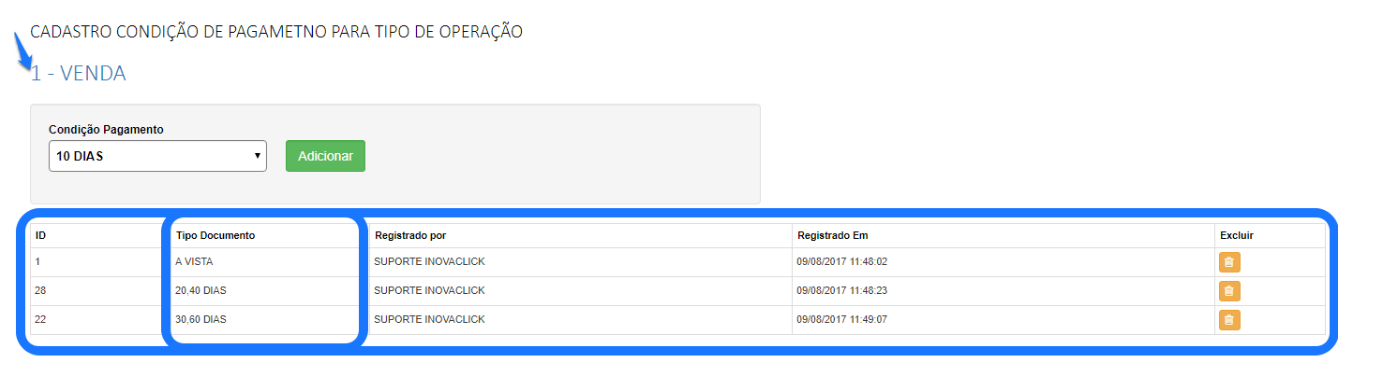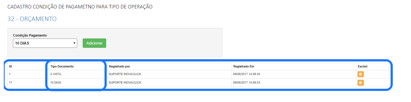 Além disso, neste aplicativo, também apresenta o histórico de log, por quem e quando foi alterado, também é possível excluir as inclusões de tipo de documento e condições de pagamento.