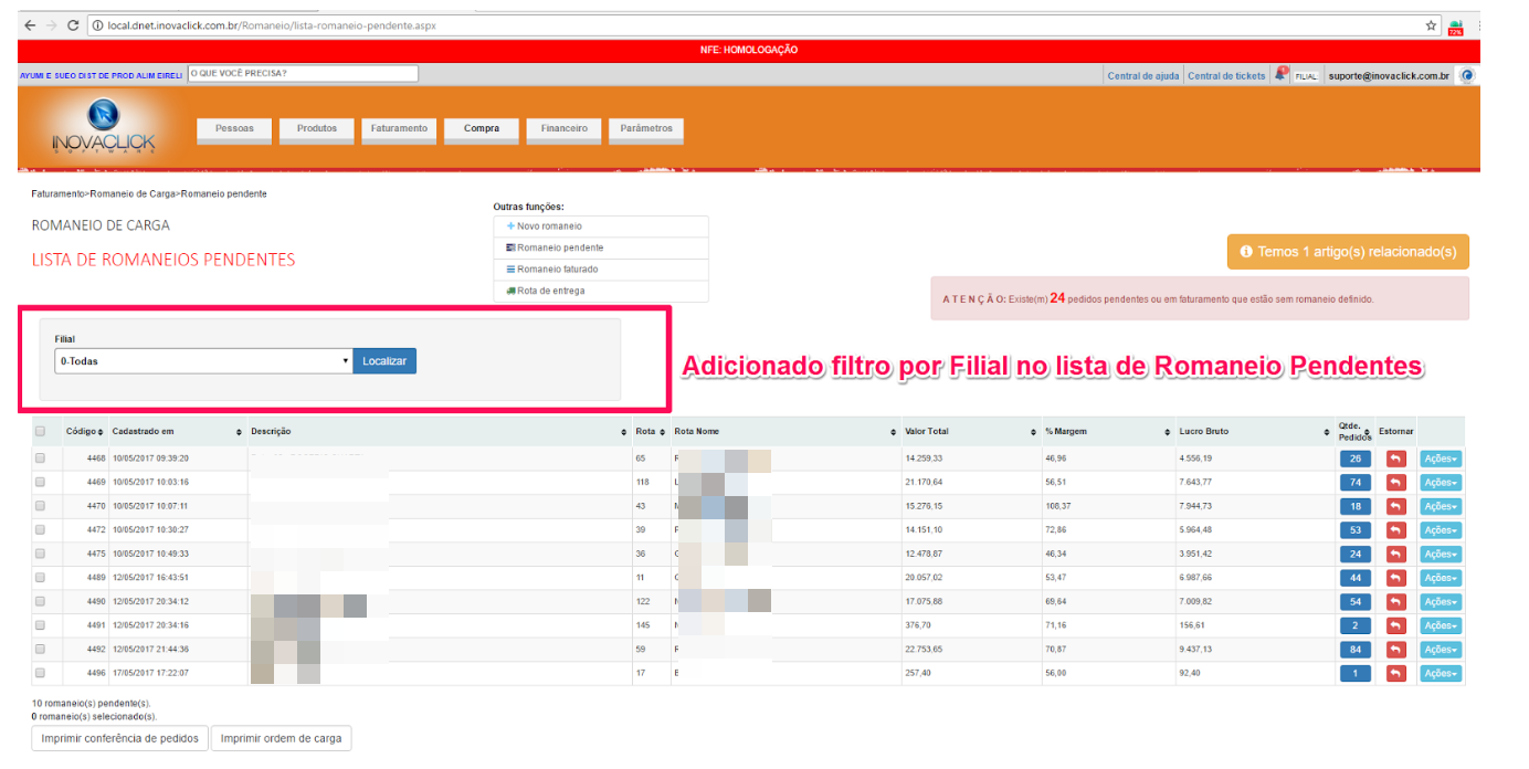 Romaneio pendente por filial. Foi adicionado um filtro para escolher a filial desejada na tela de lista de romaneio pendente.