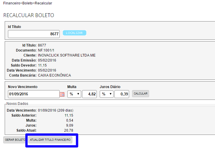 - Nova funcionalidade que recalcula e atualiza o valor do título conforme o valor calculado. (Financeiro - Boleto - Recalcular)
