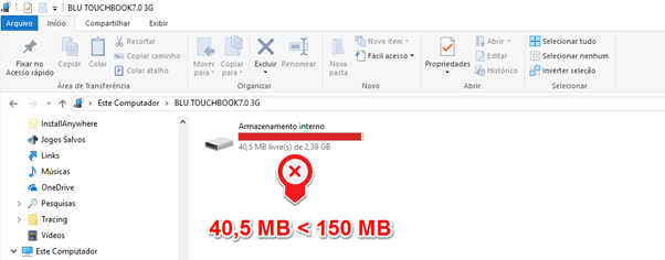 Portanto, é necessário no mínimo de espaço disponível no tablet para realizar a sincronização 150MB, se estiver inferior não realiza a sincronização e, apresenta a mensagem, caso estiver com espaço superior a sincronização é realizada com sucesso.