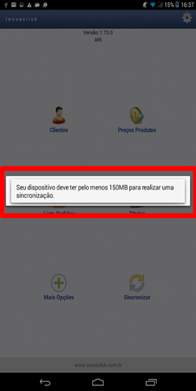 Melhoria, quando o espaço disponível no tablet for inferior a 150MB, ao sincronizar apresenta uma mensagem “Seu dispositivo deve ter pelo menos 150MB para realizar sincronização.”