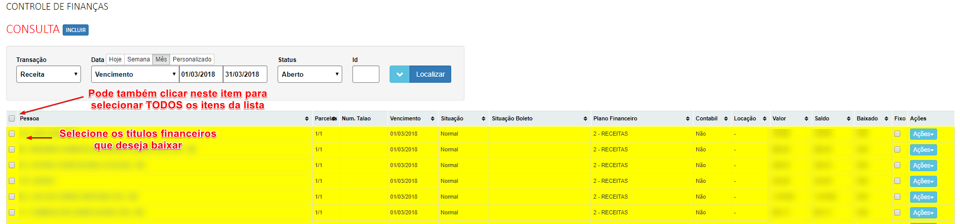 Localize os títulos que deseja baixar, ou por vencimento, cliente, tipo de documento.