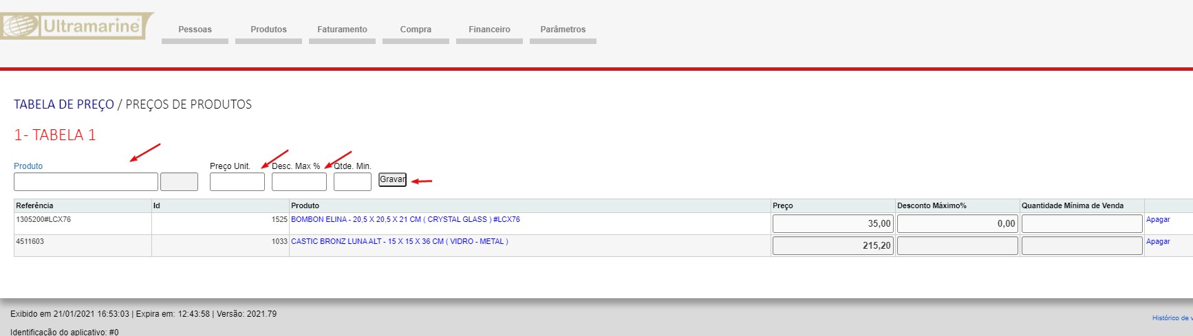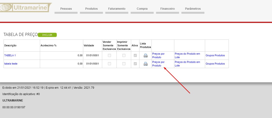 Após incluir uma nova tabela de preço/ clique em preços por produtos: