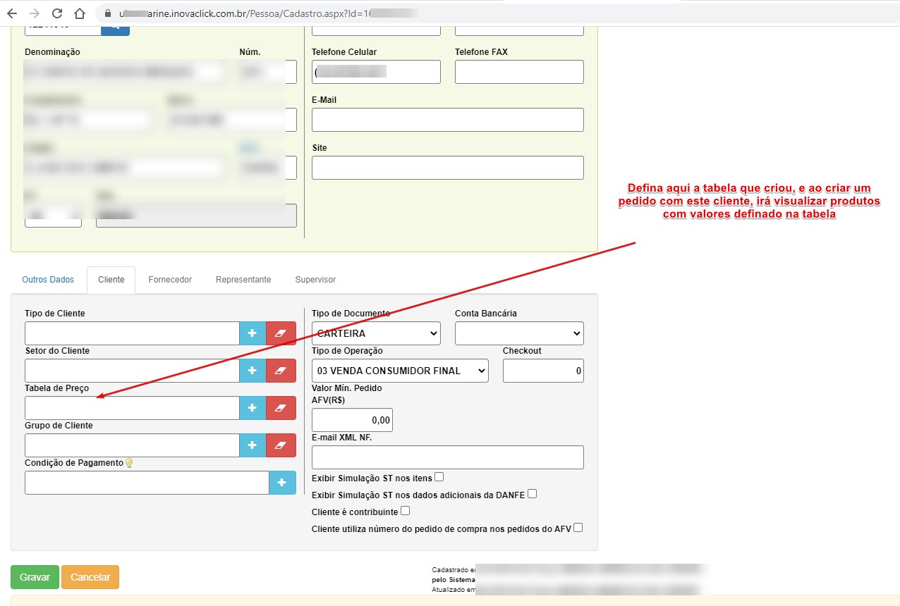 Agora clique em pessoas / encontre o cliente desejado/ manutneção do mesmo e defina a table de preço :