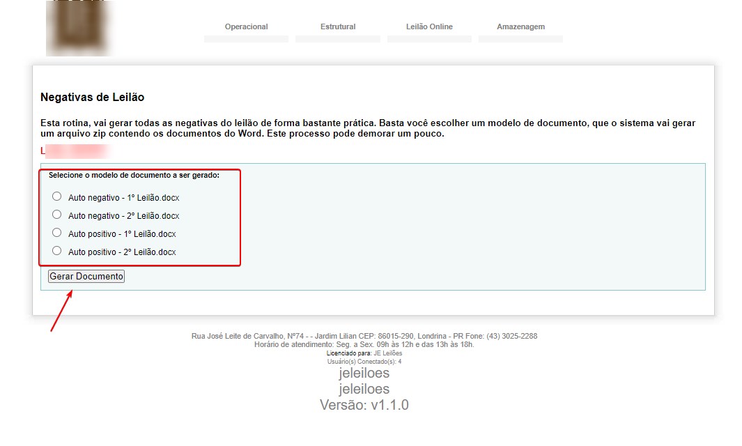Negativas de Leilão Clique no simbolo da impressora (relatorio de leilão): Clique em Negativas do leilão: Escolha o tipo de documento e clique em gerar Documento: